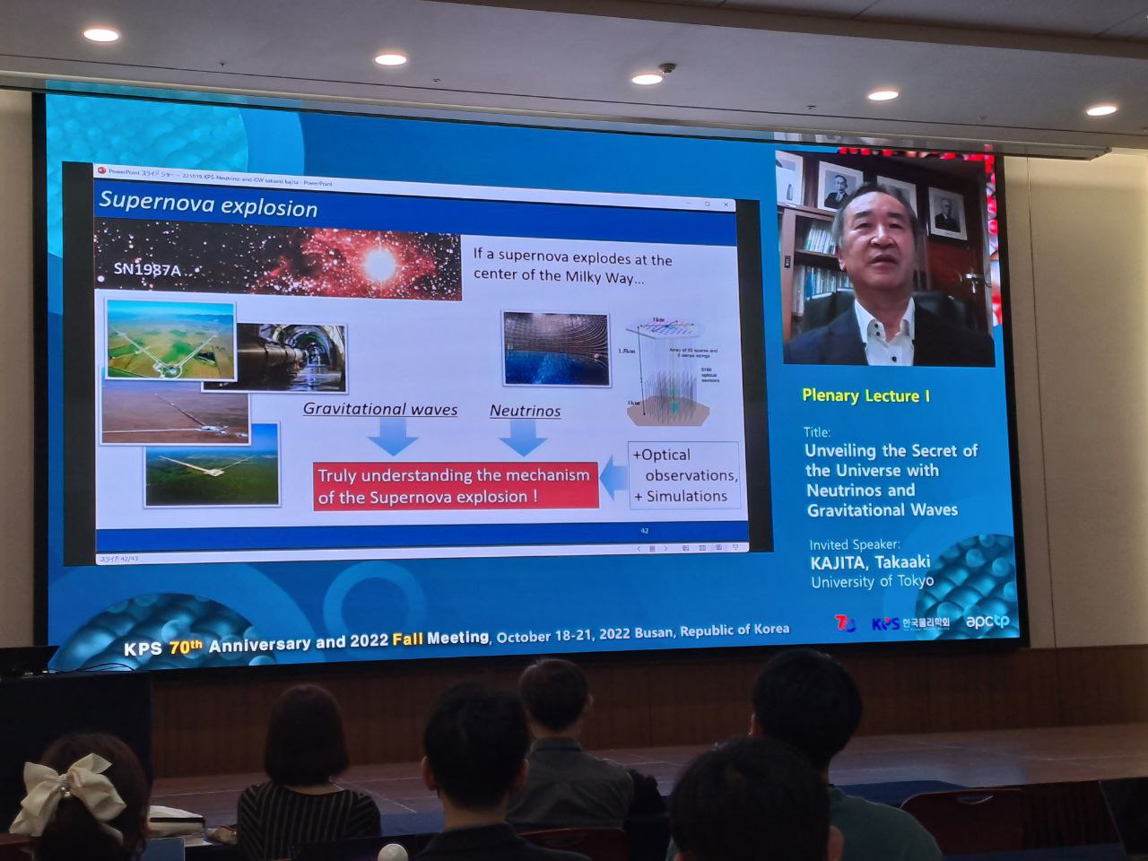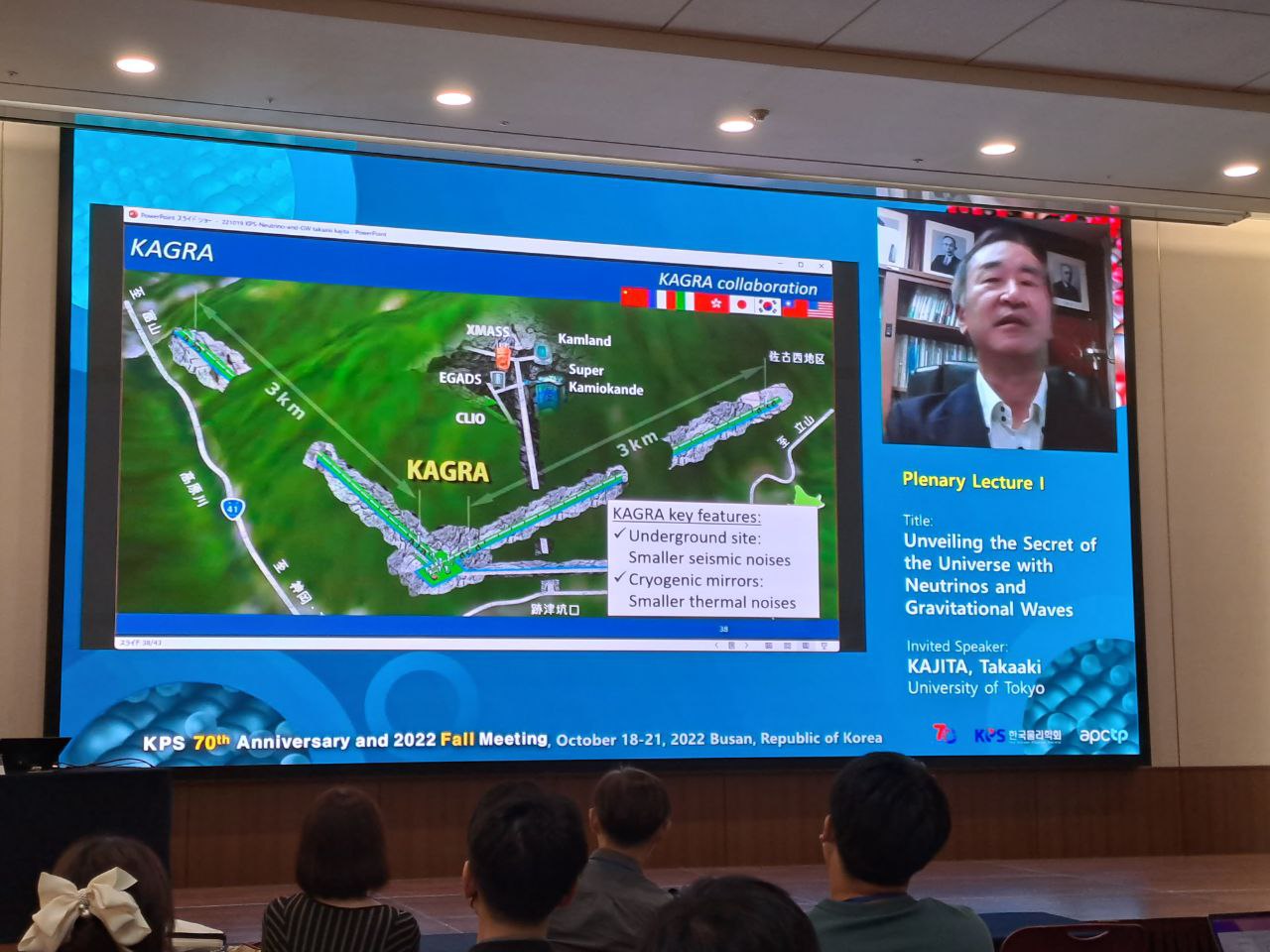 На международной конференции Корейского физического общества: KPS 70th Anniversary and 2022 Fall Meeting, которая проходит 18-21 октября в г.Пусан, состоялась лекция лауреата Нобелевской премии по физике 2015 г. профессора Такааки Кадзита (Prof. Takaaki Kajita) "Unveiling the secret of the Universe with neutrinos and gravitational waves" - "Раскрытие тайны Вселенной с помощью нейтрино и гравитационных волн".