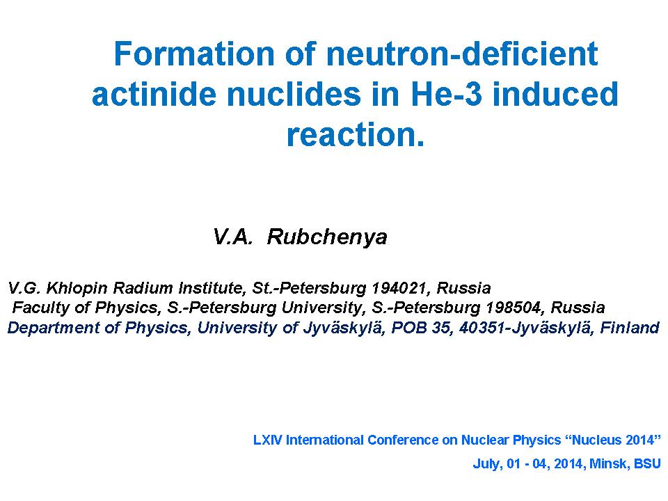 2014-07-01 25 P. Keywords: nuclear reactions Presentation from conference "Nucleus 2014", Belarusian State University, Minsk, Belarus, 1 July 2014 |