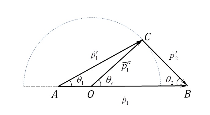 Импульс падающей частицы в л-системе, изображаемый вектором , точкой делится в пропорции масс образующихся в реакции частиц: (рисунок соответствует выбору частицы с меньшей массой в качестве первой частицы). Точка – центр окружности с радиусом, равным абсолютной величине импульсов вторичных частиц в ц-системе или . Если вектор (точка лежит на верхней полуокружности) – импульс первой образовавшейся частицы в системе центра масс, то векторы и равны соответственно импульсам частиц с массами и в лабораторной системе отсчета.