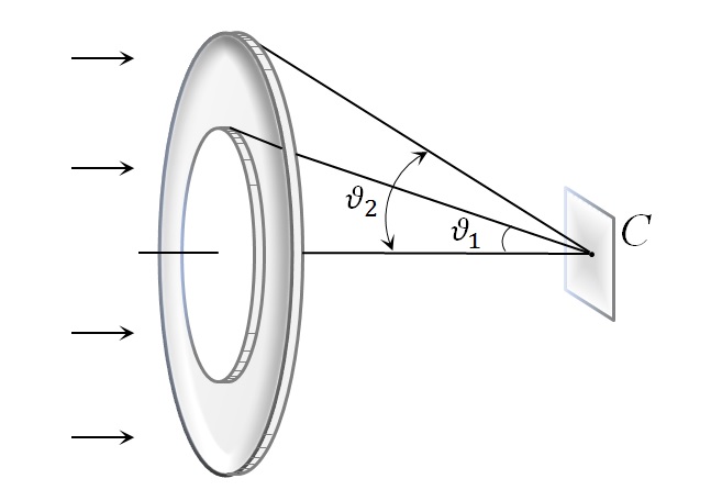 25. Плоский поток -частиц с кинетической энергией падает нормально на тонкую золотую фольгу, вырезанную в виде плоского кольца (см. рисунок). Плотность потока -частиц равна частица/(смс). Фольга содержит ядер на см поверхности. Найти – число -частиц, падающих в 1 с на 1 см поверхности экрана вблизи точки . Углы и известны, причем рассеяние в пределах этих углов подчиняется формуле Резерфорда.