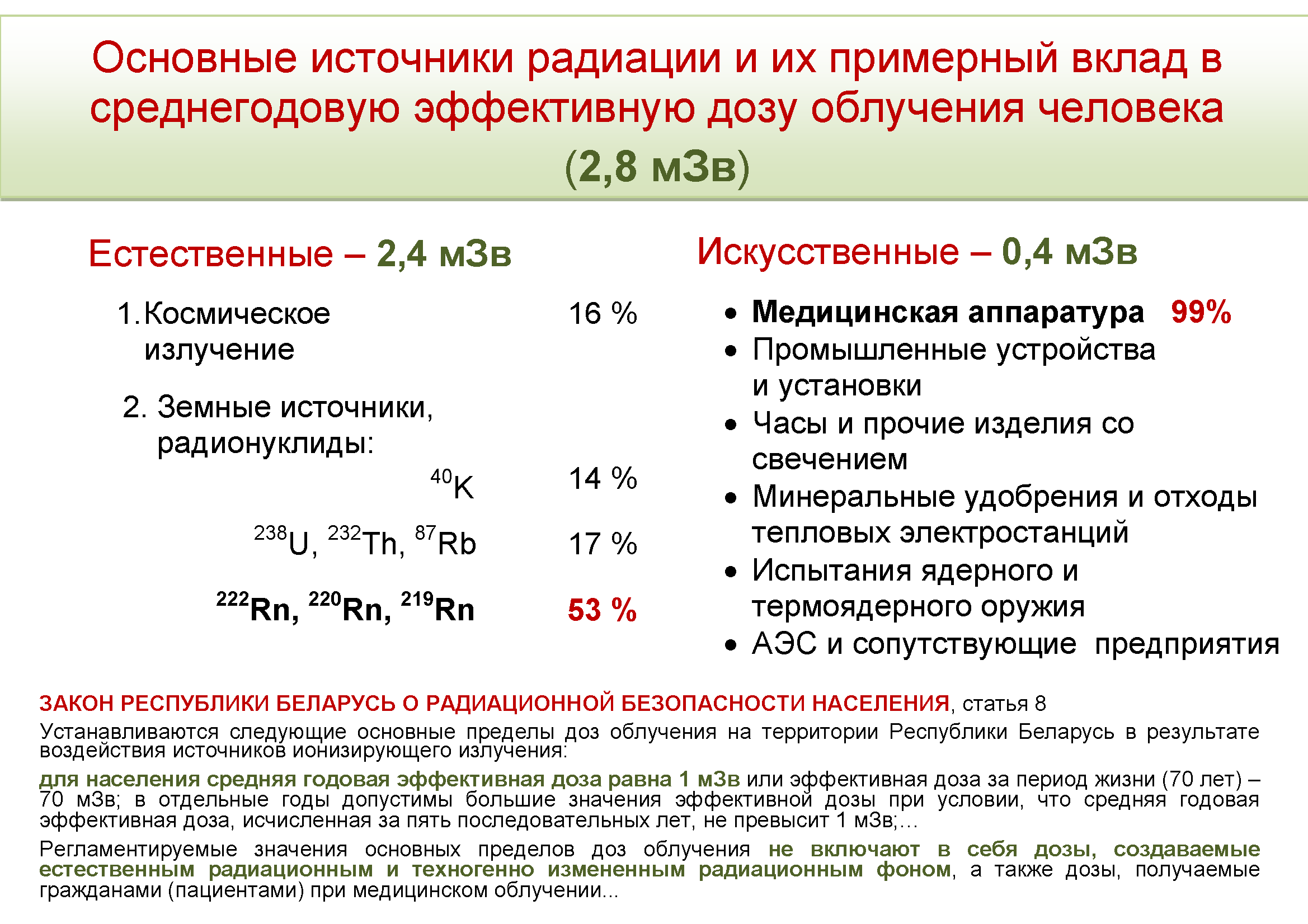 Основные источники радиации и их примерный вклад в среднегодовую эффективную дозу облучения человека