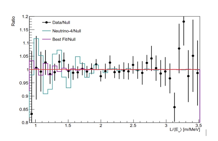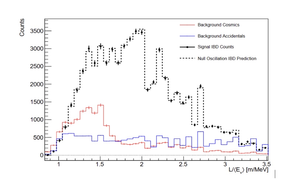 ). Основными фоновыми процессами являются фон случайных совпадений и фон от космических лучей. Полученное распределение событий соответствует гипотезе отсутствия осцилляций. Авторы исследования утверждают, что видимые на рисунке 1 структуры (осцилляции), как для сигнала, так и для фона, возникают в результате взаимодействия между формой энергетического спектра нейтрино,