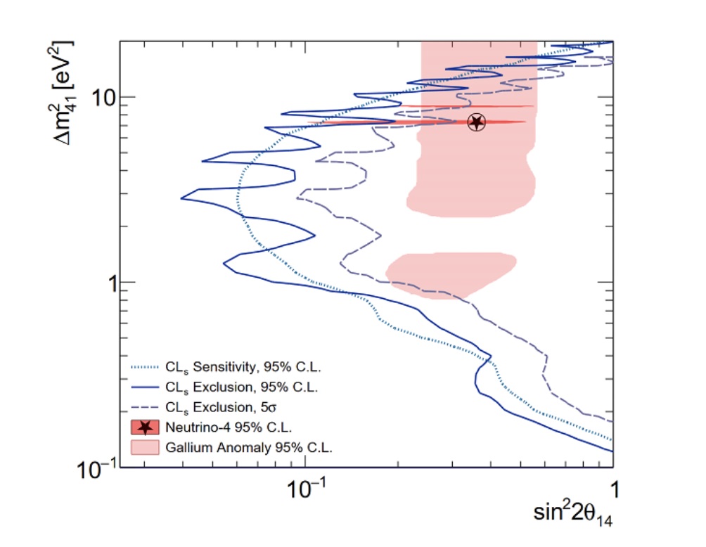 %. Светло-красным показаны параметры стерильного нейтрино, определенные экспериментом BEST, а тёмно-красным со звездой – экспериментом НЕЙТРИНО-4. Источник: препринт статьи PROSPECT.