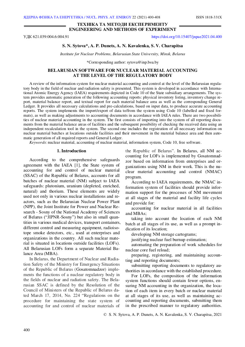 S.N. Sytova, A.P. Dunets, A.N. Kavalenka, S.V. Charapitsa