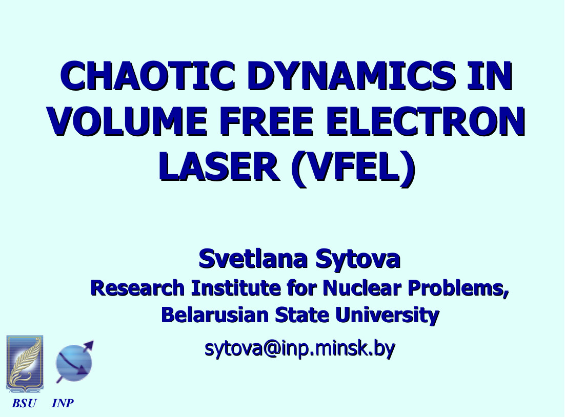 In VFEL operation the linear stage investigated in many papers (see [1]) quickly changes into the nonlinear one where most of the electron beam energy is transformed into electromagnetic radiation. A detailed numerical analysis of this stage is necessary for experiment design, optimal geometry determination and result processing. Mathematical model and numerical methods for VFEL nonlinear stage simulation were proposed [3], [4]. They are implemented in computer code VOLC [5]. Different VFEL geometries were investigated [3]-[6] numerically. All numerical results are in good agreement with analytical predictions. In electronic generators and amplifiers such as free electron lasers, backward wave tube, travelling wave tube etc. self-oscillations are due to interaction of electron beam and electromagnetic field under distributed feedback. Investigation of chaos in such devices is of great interest in modern physics. In VFEL chaotic dynamics is induced by such interaction too. Investigation of chaos in VFEL is important in the light of experimental development of VFEL in Research Institute for Nuclear Problems. As more than ten control parameters are in the system it is very complicated to investigate the full picture of possible chaotic behaviour in VFEL. We restricted ourselves to investigate here the chaotic behaviour in two-wave VFEL for Bragg geometry in amplifier and oscillator generation regimes. We considered some cases of possible root to chaos in VFEL for laser intensity with corresponding space portraits and attractors. Solution bifurcation points cor-responding to transitions between different regimes of generation are considered. Parametric maps with respect to electron beam current and (1) geometry parameter, (2) detuning from exact Cherenkov condition present complicated root to chaos with windows of periodicity. It is demonstrated that this root is carried out via period-doubling cascade, quasiperiodicity and intermittency. References 1.V.G. Baryshevsky, K.G. Batrakov et al., First lasing of a volume FEL (VFEL) at a wavelength range 4-6 mm. Nucl. Instr. and Meth. in Phys. Res., A483, 21-24, 2002. 2. V.G. Baryshevsky, I.D. Feranchuk, Parametric beam instability of relativistic charged particles in a crystal. Physics Let. A., 102, 141–144,1984. 3. K. Batrakov, S. Sytova, Nonstationary stage of quasi-Cherenkov beam instability in periodical structures. Mathematical modelling and analysis, 10, 1-8, 2005. 4. K. Batrakov, S. Sytova, Modelling of Volume Free Electron Lasers. Computational Mathematics and Mathematical Physics, 45, 666–676, 2005 5. K. Batrakov, S. Sytova, Mathematical modelling of multiwave Volume Free Electron Laser: basic principles and numerical experiments. Mathematical modelling and analysis, 11, 13–22, 2006. 6. K. Batrakov, S. Sytova, Dynamics of electron beam instabilities under conditions of multiwave distributed feedback. Nonlinear Phenomena in Complex Systems, 8, 359–365, 2005. |