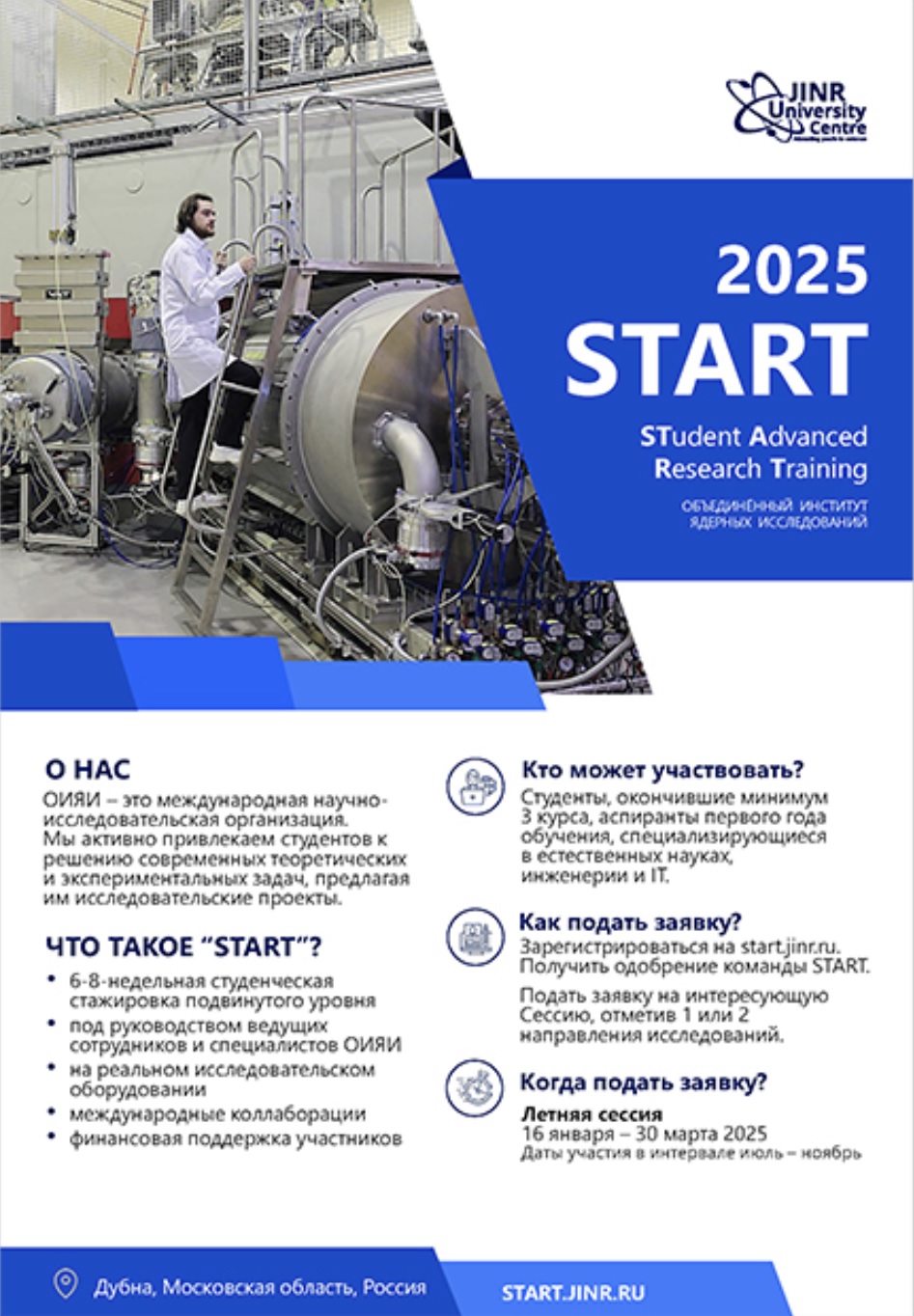 2025-01-31 Международная программа START (STudent Advanced Research Training) приглашает студентов и аспирантов присоединиться к научно-исследовательской работе в Объединенном институте ядерных исследований (г. Дубна, Российская Федерация). Прием заявок на Летнюю сессию 2025 года ведется на сайте start.jinr.ru до 31 марта. START (STudent Advanced Research Training at JINR) — это выездная студенческая программа Объединенного института ядерных исследований (ОИЯИ). Принять участие в программе может любой студент, начиная с 3-го курса бакалавриата и заканчивая 1-м курсом аспирантуры, без предыдущего опыта участия в программе START. Потенциальный участник должен проходить обучение по специальностям в области естественных наук, инженерии и информационных технологий, соответствующих одному из научных направлений ОИЯИ. В число последних входят: теоретическая физика (Лаборатория теоретической физики Боголюбова), физика элементарных частиц и релятивистская ядерная физика (Лаборатория физики высоких энергий им. В.И. Векслера и А.М. Балдина), ядерная физика (Лаборатория нейтронной физики им. И.М. Франка, Лаборатория ядерных реакций Флерова, Лаборатория ядерных проблем им. В.П. Джелепова), физика конденсированного состояния вещества, радиационные и радиобиологические исследования (Лаборатория ядерных реакций Флерова, Лаборатория радиационной биологии), сети, вычисления и вычислительная физика (Лаборатория информационных технологий), инженерия и приборостроение (Лаборатория физики высоких энергий им. В.И. Векслера и А.М. Балдина, Университетский центр инженерной практики, Лаборатория ядерных проблем им. В.П. Джелепова, Лаборатория нейтронной физики им. И.М. Франка, Лаборатория ядерных реакций Флерова) Каждая сессия имеет фиксированный срок подачи заявки и временной интервал, рекомендованный командой, в течение которого студенту предлагается приехать и остаться в Дубне на 6-8 недель по согласованию с куратором проекта. Участие в программе предполагает работу над исследовательским проектом под руководством ведущих экспертов ОИЯИ. По окончании практики участники готовят письменный отчет о проделанной работе, который размещается на сайте программы. Таким образом, открывается уникальная возможность пройти обучение на действующих объектах ОИЯИ, определиться с темой будущей диссертации, найти научного руководителя, повысить свои шансы быть принятыми на работу в ОИЯИ. Участники программы START проживают в общежитии ОИЯИ на бесплатной основе, получают суточные, им компенсируются транспортные, визовые и страховые расходы. Для подачи заявки необходимо зарегистрироваться на сайте программы, заполнив регистрационную форму, приложив все необходимые документы и отметив 1-3 из доступных научных областей, соответствующих вашей сфере обучения. После одобрения анкеты вы получите письмо с логином и паролем, с помощью которых сможете войти в систему как студент и подать заявку на участие в сессии. По результатам конкурсного отбора на электронную почту будет выслано соответствующее письмо. В Подробнее приведены ключевые даты летней сессии и некоторые важные ссылки. Основные даты летней сессии 2025 года