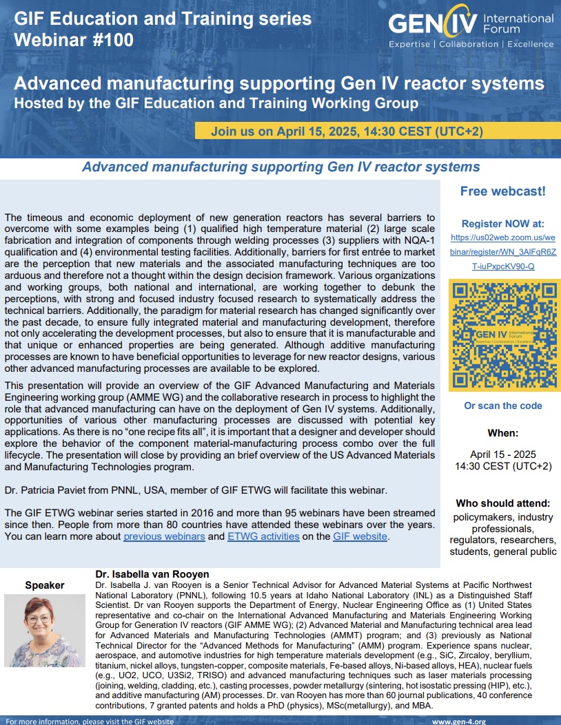 Международный форум «Поколение IV» (Generation IV International Forum, GIF) приглашает принять участие в образовательном вебинаре «Передовые производственные технологии для реакторных систем поколения IV» (Advanced manufacturing supporting Gen IV reactor systems).