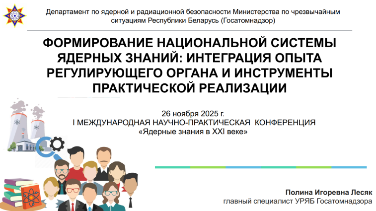 УДК 621.039 2025-11-29 Источник: 1-я Междунар. конф. "Ядерные знания в XXI веке" (26 ноября 2025 г., Минск, Беларусь) Ключевые слова: менеджемент знаний, ядерные знания, радиационная безопасность, информационные технологии, атомная энергетика Презентация доклада главного специалиста УРЯБ Госатомнадзора Лесяк Полины Игоревны на 1-й Международной научно-практической конференции "Ядерные знания в XXI веке", состоявшейся 26 ноября 2025 г. на базе Института ядерных проблем БГУ (Минск, Беларусь).