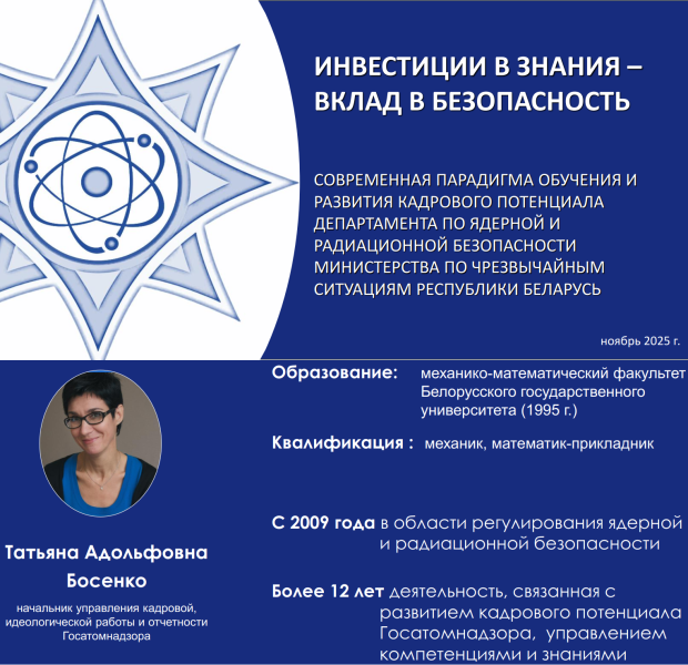 УДК 621.039 2025-11-29 Источник: 1-я Междунар. конф. "Ядерные знания в XXI веке" (26 ноября 2025 г., Минск, Беларусь) Ключевые слова: обучение, ядерные знания, кадровый потенциал, ядерная безопасность Презентация доклада начальника управления кадровой, идеологической работы и отчётности Госатомнадзора Босенко Татьяны Адольфовны на 1-й Международной научно-практической конференции "Ядерные знания в XXI веке", состоявшейся 26 ноября 2025 г. на базе Института ядерных проблем БГУ (Минск, Беларусь).