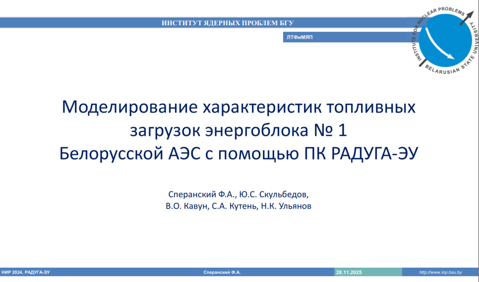 УДК 621.039.5 2025-11-29 Источник: 1-я Междунар. конф. "Ядерные знания в XXI веке" (26 ноября 2025 г., Минск, Беларусь) Ключевые слова: топливные загрузки, энергоблок, атомная электростанция, моделирование Презентация доклада старшего научного сотрудника лаборатории теоретической физики и моделирования ядерных процессов НИИ ЯП БГУ Сперанского Филиппа Александровича на 1-й Международной научно-практической конференции "Ядерные знания в XXI веке", состоявшейся 26 ноября 2025 г. на базе Института ядерных проблем БГУ (Минск, Беларусь). Доклад представлен от авторского коллектива НИИ ЯП БГУ.